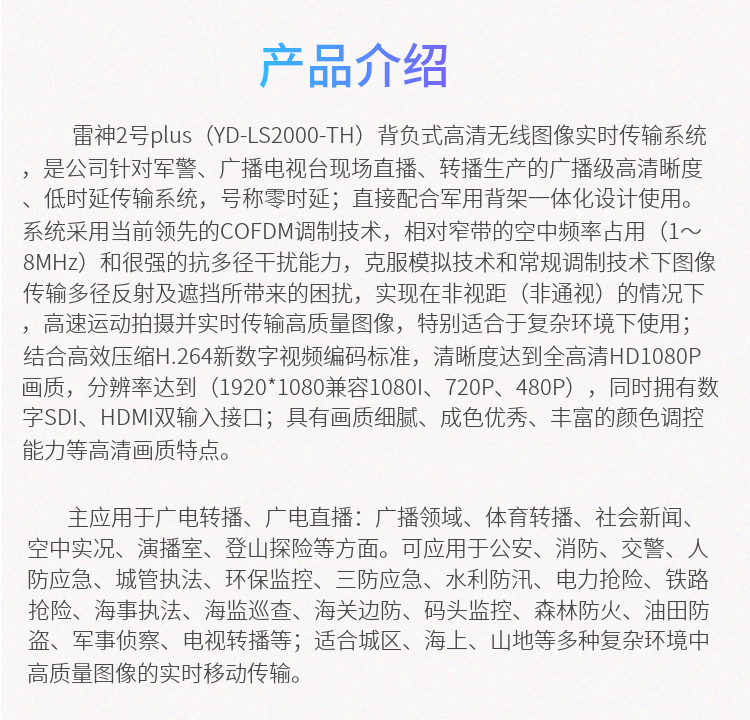 雷神2號plus(YD-LS2000-TH)背負式高清無線圖像實時傳輸系統(tǒng),是公司針對軍警、廣播電視臺現(xiàn)場直播、轉播生產(chǎn)的廣播級高清晰度、低時延傳輸系統(tǒng),號稱零時延;直接配合軍用背架一體化設計使用。系統(tǒng)采用當前領先的COFDM調制技術,相對窄帶的空中頻率占用(1~8MHz)和很強的抗多徑干擾能力,克服模擬技術和常規(guī)調制技術下圖像傳輸多徑反射及遮擋所帶來的困擾,實現(xiàn)在非視距(非通視)的情況下,高速運動拍攝并實時傳輸高質量圖像,特別適合于復雜環(huán)境下使用;結合高效壓縮H.264新數(shù)字視頻編碼標準,清晰度達到全高清HD1080P畫質,分辨率達到(1920*1080兼容1080I、720P、480P),同時擁有數(shù)字SDI、HDMI雙輸入接口;具有畫質細膩、成色優(yōu)秀、豐富的顏色調控能力等高清畫質特點。